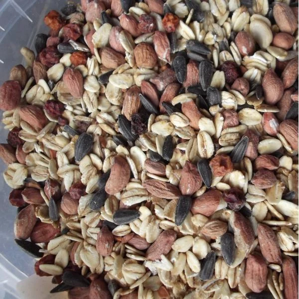 Zeer energierijk voeder met graanvlokken, zaden, gedroogde besjes, zwarte zonnebloempitten, gepelde pindanoten,… voor vogels in de tuin.