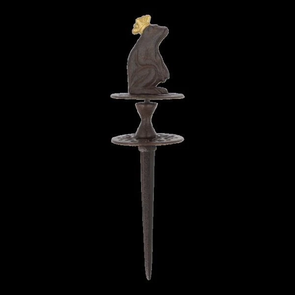 Antiekbruine gietijzeren tuinslanggeleider met decoratieve kikkerkoning op top. Met de hulp van deze decoratieve tuinslanggeleider trek je de tuinslang bij het gieten niet meer doorheen de plantenborders, maar glijden ze netjes langs de geleider en volgen ze de opgegeven route.