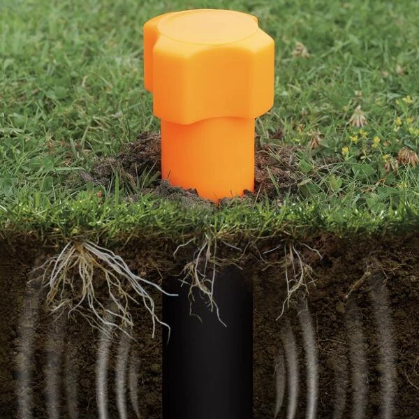 De mollenverjager beschermt een gebied van maar liefst 1000 m². Voor grotere of onregelmatige tuinoppervlakten heb je meer dan 1 mollenverjager nodig. De kap heeft een fel oranje kleur zodat de trilbuis steeds voldoende wordt opgemerkt, ze zorgt bovendien voor een IP waarde van 44!