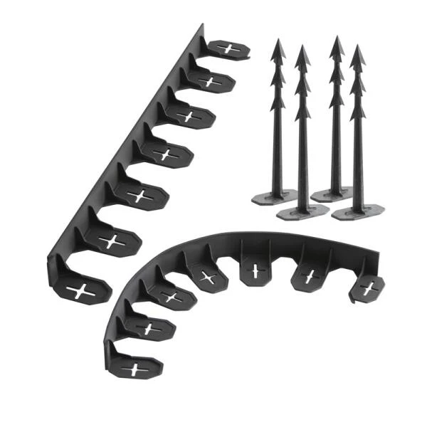 De 8 rechte borderlatten zijn goed te buigen waardoor je er zowel rechte borders kan mee afboorden alsook golvende borders tot cirkels mee kan vormen. Met behulp van de 24 mee geleverde grondpennen zet je de latten stevig vast in de gewenste vorm. Deze zwarte afboording is gemaakt van stevig, weerbestendig polypropyleen.