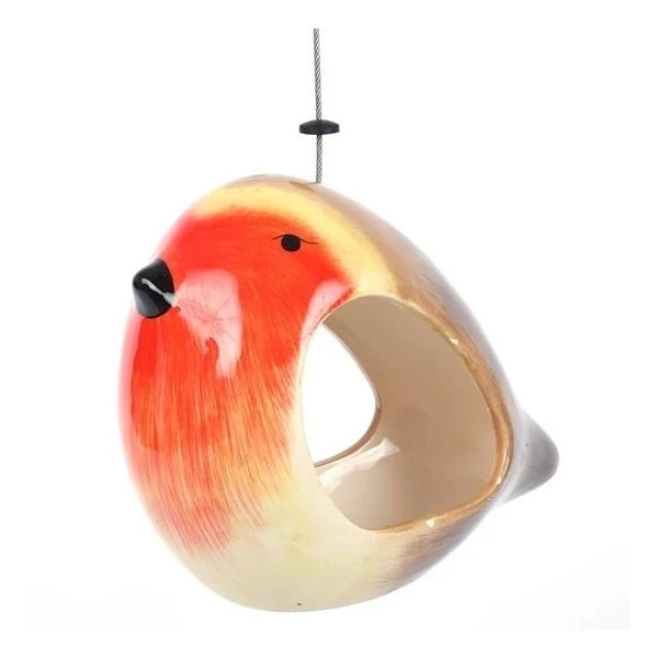 Decoratieve vogelvoederplaats in keramiek. Deze glanzende roodborst kan gebruikt worden voor het aanbieden van zaden, meelwormen en andere lekkernijen voor tuinvogels.
