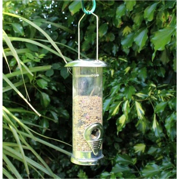 Een kwalitatieve zadenvoedersilo waarvan de basis gemaakt is uit metaal en de houder op zich uit stevig transparante kunststof. De silo kan eenvoudig gevuld en gereinigd worden via het deksel.